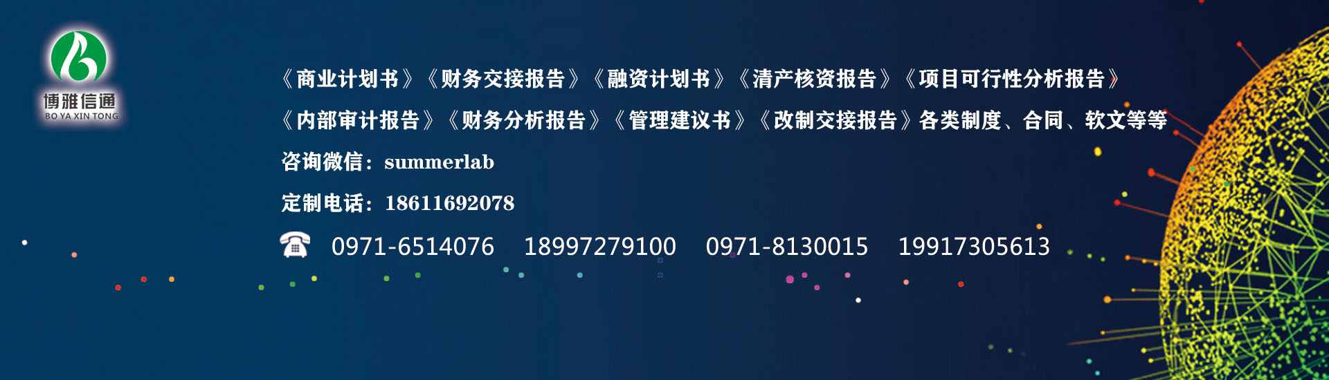 北京博雅信通會計服務有限公司西寧分公司為各中小企業提供各種專業工商財稅會計服務。包括公司設立籌劃、公司注冊、執照變更、代辦注銷、代理記賬報稅、亂賬整理、會計實操培訓、會計職稱培訓(會計取證培訓)等一站式服務體系,誠信、專業、高效、省心! 公司簡介: 北京博雅信通會計服務有限公司西寧分公司 成立于2003年,積累了幾十個行業工商財稅會計服務經驗,主要提供公司注冊、執照變更、企業注銷、工商年報、代理記賬、納稅申報、會計培訓、財稅顧問等一系列服務。全程工商財稅老板們甩手我們代理,并且用足用好工商財稅優惠政策,讓企業老板省心、省時、省事兒!節約會計核算和納稅成本,解放您的寶貴時間抓好企業經營,做您的...